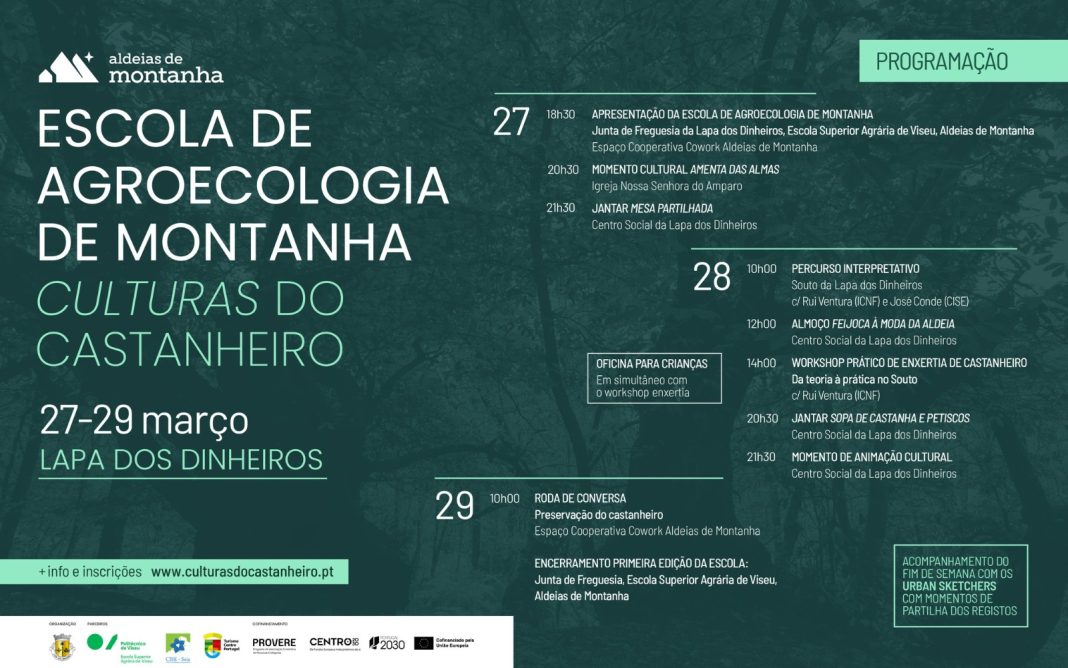 A Rede de Aldeias de Montanha apresenta a Academia Aldeias de Montanha, uma iniciativa que materializa um novo modelo conceptual de intervenção no território. Entre os dias 27 e 29 de março, a Lapa dos Dinheiros, em Seia, acolhe a 1ª Escola de Agroecologia de Montanha, uma atividade dedicada a valorizar e aprender mais sobre o castanheiro. Este projeto afirma-se pelo seu carácter inovador ao juntar o conhecimento técnico, através da parceria com a Escola Superior Agrária de Viseu (ESAV) e o saber das comunidades locais. Esta união serve de base a um modelo de turismo comunitário e regenerativo. Neste modelo, o turista não é um mero espectador, pois é envolvido ativamente na preservação da paisagem.