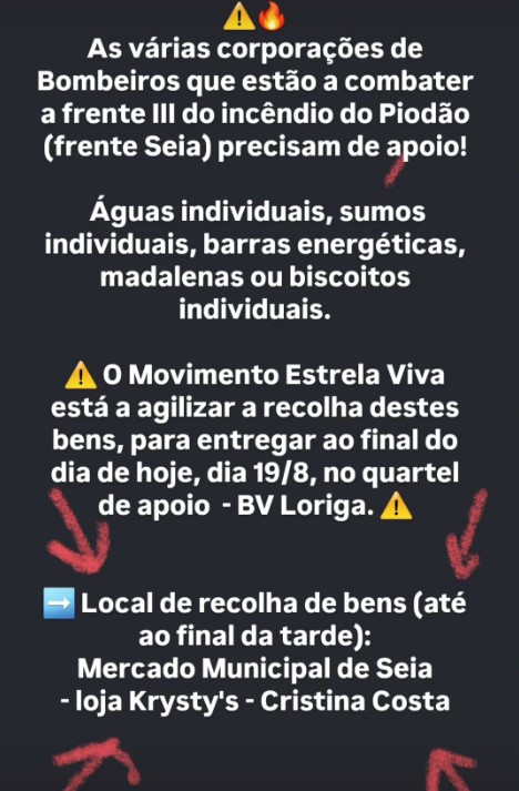 Movimento Estrela Viva está a organizar a recolha de alguns bens para entregar ao final da tarde de hoje, no quartel de apoio dos Bombeiros Voluntários de Loriga. O local de recolha é no Mercado Municipal de Seia, até ao final desta tarde.
