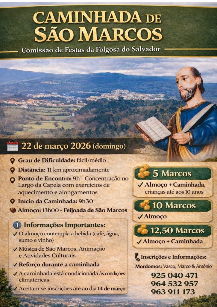 Os Mordomos da Festa de São Marcos da Folgosa do Salvador está a organizar a Caminhada de São Marcos, agendada para o próximo dia 22 de março (domingo). O evento inserido no plano de atividades da comissão, tem como objetivo principal a angariação de fundos para a realização da tradicional Festa de São Marcos.