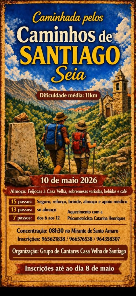 O Grupo de Cantares Casa Velha de Santiago (Seia) promove, no próximo dia 10 de maio, a “Caminhada pelos Caminhos de Santiago”, um evento que promete um dia de convívio e bem-estar, focado no contacto com a natureza e na valorização das rotas históricas da região.