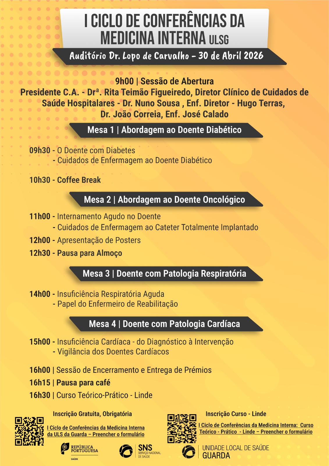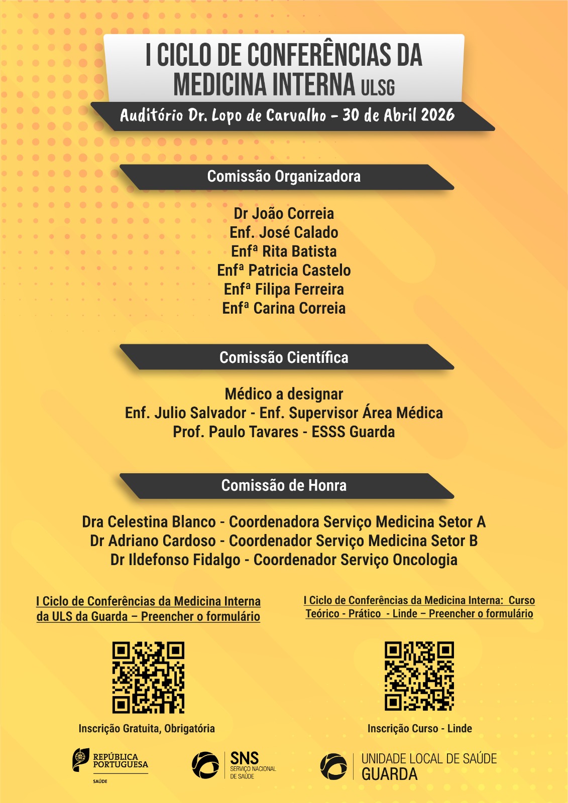 A Unidade Local de Saúde da Guarda (ULSG) promove, no próximo dia 30 de abril de 2026, o I Ciclo de Conferências da Medicina Interna, que terá lugar no Auditório Dr. Lopo de Carvalho.