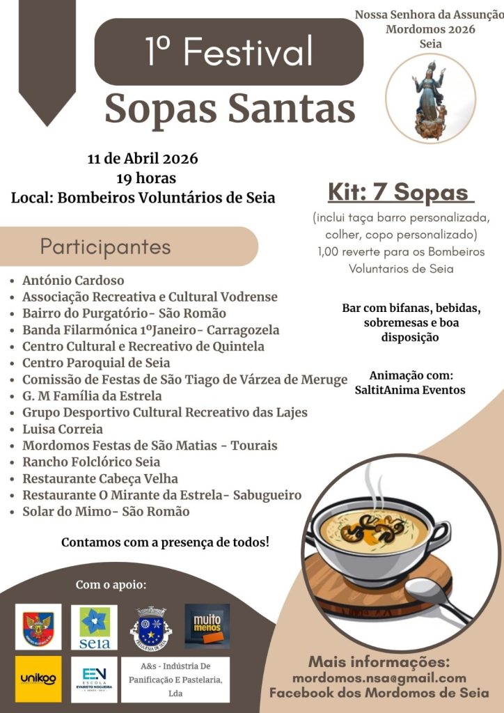 ​A cidade de Seia prepara-se para uma noite de sabores tradicionais com a realização do 1º Festival Sopas Santas. O evento, organizado pelos Mordomos de Nossa Senhora da Assunção 2026, terá lugar no próximo dia 11 de abril, sábado, a partir das 19 horas, no quartel dos Bombeiros Voluntários de Seia.
