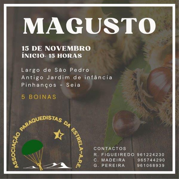 A Associação Paraquedistas da Estrela (A.P.E.) vai promover um Magusto, um momento de convívio e celebração da camaradagem que une os seus membros. O evento está marcado para o próximo dia 15 de novembro, a partir das 15h00, no Largo de São Pedro, nas instalações do antigo Jardim de Infância de Pinhanços (Seia).