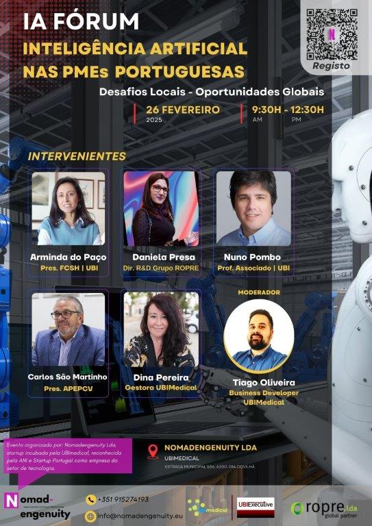 A Nomadengenuity Lda, uma empresa “incubada” na UBImedical (Universidade da Beira Interior – Covilhã) vai promover, no dia 26 de fevereiro, o evento “IA FÓRUM 2025 – Inteligência Artificial nas PMEs Portuguesas”.