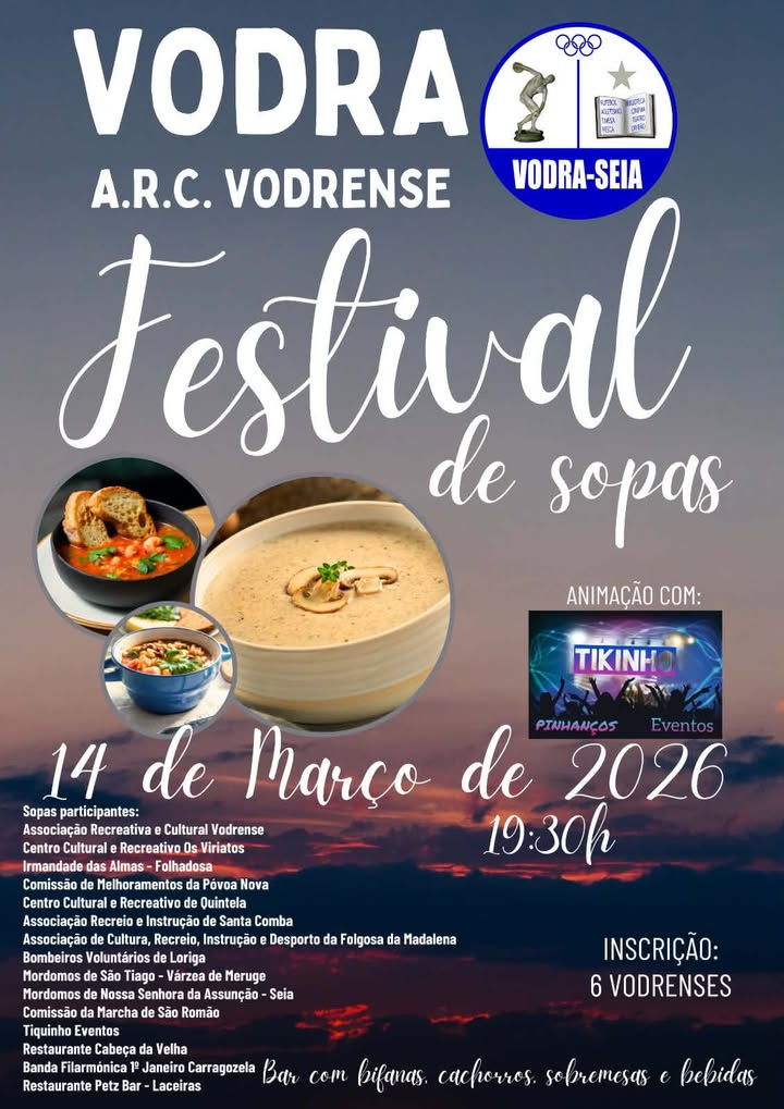 A localidade de Vodra prepara-se para uma noite de convívio com a realização de mais uma edição do seu Festival de Sopas. O evento, organizado pela A.R.C. Vodrense, terá lugar no próximo dia 14 de março (sábado), na sua sede, com início marcado para as 19h30.